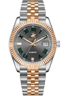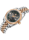 Мужские часы в стальном корпусе с частично розовым покрытием и надежным кварцевым механизмом. Серый циферблат с зелеными римскими цифрами, украшенный бриллиантом. Апертура даты на «3 часах». Минеральное стекло с сапфировым напылением, устойчивое к потертостям и царапинам. Оснащены стальным браслетом с частично розовым покрытием. Оригинальный дизайн со стильными элементами подойдет современному мужчине и станет прекрасным завершением его образа.