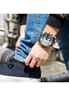 Внушительные часы с функциями нескольких часовых поясов и хронографа для стильных и уверенных в себе путешественников. Мужские часы-хронограф с секундомером на основном циферблате. Круглый стальной корпус цвета оружейной стали с матовыми и полированными деталями. Многофункциональный серебристый циферблат с черными и красными акцентами. Четыре механизма и четыре часовых пояса. На основном циферблате: метки в виде штрихов, минутная шкала, счетчики на 60 секунд и 30 минут, 12-ти и 24-х часовой формат времени, окошко даты в положении 3 часа. На двух дополнительных циферблатах указатели часов и минут в виде вращающихся дисков, на третьем — на вращающемся диске указатель секунд. Удобный ремешок из натуральной коричневой кожи.