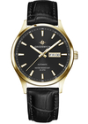 Элегантность, классические линии и уважение традиций задают тон дизайну часов серии Good Luck. Корпус модели, состоящий из трех частей, можно с уверенностью назвать массивным: его диаметр равен 43 мм. Корпус сделан из нержавеющей стали с PVD-покрытием из желтого золота, двумя видами полировки: зеркальной по безелю и матированием. Задняя крышка прозрачная: вы сможете без проблем любоваться автоматическим механизмом TMI, на роторе которого выгравирован силуэт парусника, символа английских мореходов, и название серии. На фоне черного циферблата с полировкой и эффектом градиента расположились накладные риски и крупные стрелки. Они хорошо читаются при любых условиях освещения — люминесцентный состав, которым покрыты эти элементы, светится в темноте. Окошко даты и дня недели выделяет стальная рамка. В модели установлено минеральное стекло. Повышенная водостойкость составляет 10 атмосфер. Часы дополняет ремешок из натуральной кожи черного цвета с прошивкой. Автоматические часы Greenwich хорошо подходят для того, чтобы носить их каждый день. Их универсальный дизайн сочетается практически с любыми предметами гардероба, а механизм заводится, находясь на запястье владельца.