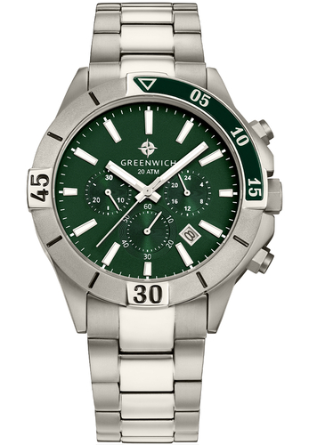 Легкость, прочность и гипоаллергенность: эти преимущества обеспечивает титан, из которого выполнены корпус и браслет кварцевых часов Greenwich серии Whale. Титановые часы действительно легче аналогичных моделей, сделанных из стали, что очень удобно для ежедневного использования. Титан идеально подходит для частых контактов с кожей запястья, так как практически не вызывает аллергических реакций. Корпус часов Whale довольно массивный, его диаметр равен 44 мм, в конструкции предусмотрена защита для рельефной заводной головки. На поворотный безель вынесена дополнительная шкала с выделенным сегментом 0-15 секунд.