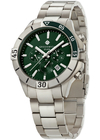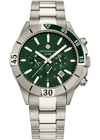 Зеленый матовый циферблат, защищенный минеральным стеклом, включает накладные риски и центральные стрелки, покрытые специальным люминесцентным составом, три дополнительных индикатора, выделенных визуально полировкой в виде солнечных лучей, и окошко даты. Засекать время в минутах и секундах можно с помощью кнопок хронографа, вынесенных на боковую часть корпуса.